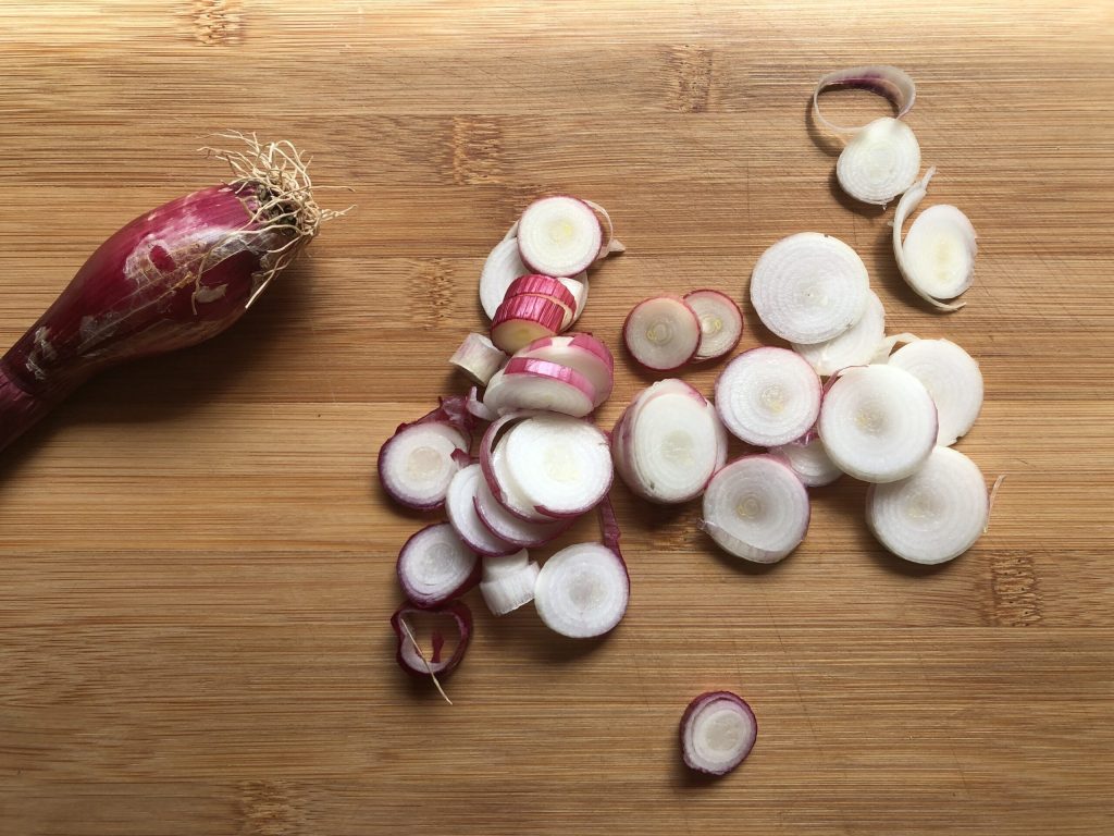 • Descasque as cebolinas, retire as raízes e corte-as em rodelas finas.