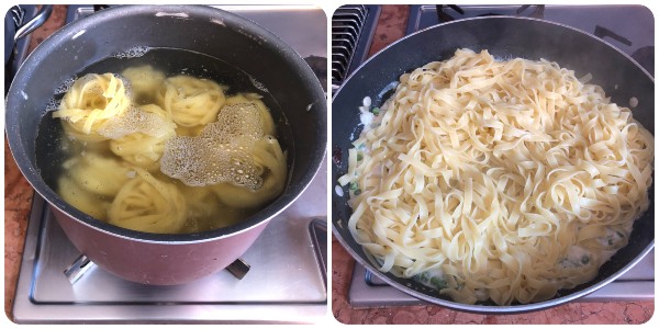 Preparação das tagliatelle com creme de ricota e ervilhas