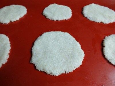 Após o tempo de descanso, retire a mistura da geladeira e pegue colheradas dela. Coloque-as na assadeira forrada com papel manteiga (eu usei um tapete de silicone) e achate-as bem como mostrado na foto.