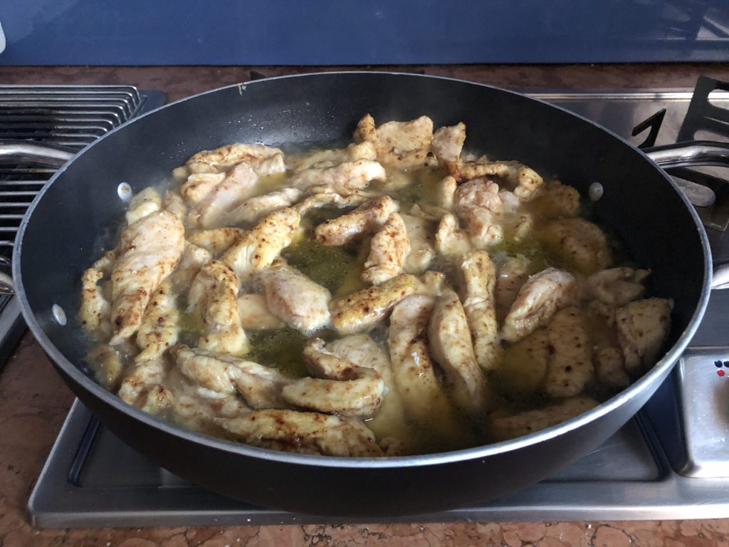 Em uma panela grande, derreta a manteiga com algumas colheres de azeite, depois adicione as tirinhas de frango e doure rapidamente.