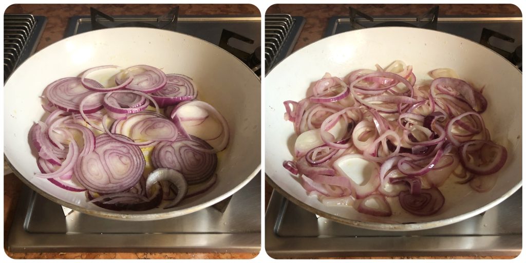 Em uma frigideira, aqueça algumas colheres de azeite e algumas colheres de água antes de adicionar a cebola. Cozinhe em fogo baixo por 5/6 minutos ou até que fiquem macias. Adicione mais água, se necessário, e mexa frequentemente.
