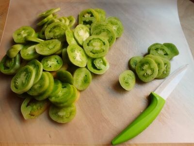 Lave os tomates verdes e corte-os em fatias não muito grossas.