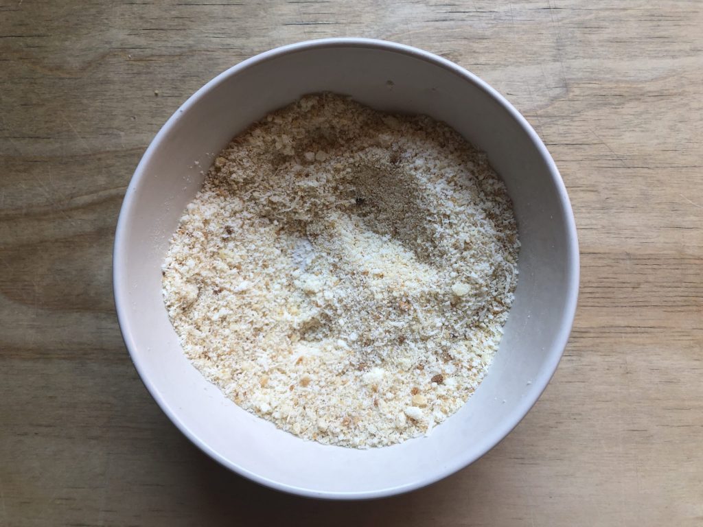 Em uma tigelinha, misture a farinha de rosca com o queijo ralado.