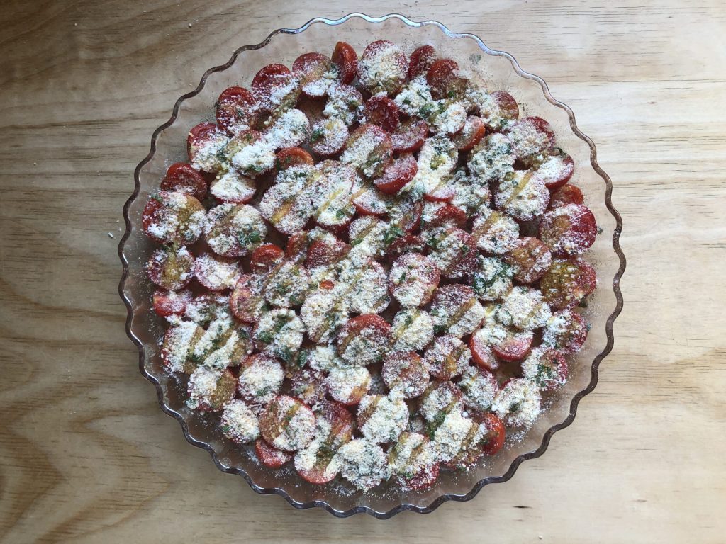 Distribua essa mistura sobre os tomatinhos de forma uniforme e regue com um fio de azeite.