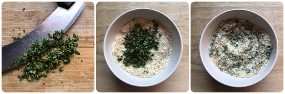 Pique as alcaparras junto com a salsinha e adicione à farinha de rosca. Você pode usar alcaparras em sal ou em conserva. Em ambos os casos, enxágue bem em água corrente e seque-as com papel toalha.