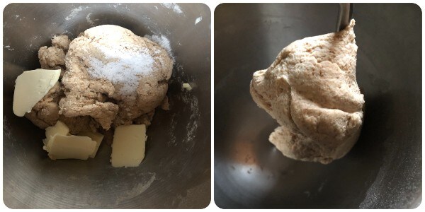 Quando a massa tiver absorvido todos os líquidos, adicionar a manteiga macia em pedaços e o sal, e continuar a trabalhar com o gancho até obter uma massa lisa e homogênea.