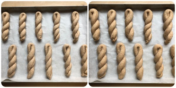 Colocar os torcidinhos em uma assadeira forrada com papel manteiga, cobri-los com um pano de prato limpo e deixá-los crescer por pelo menos mais uma hora.
