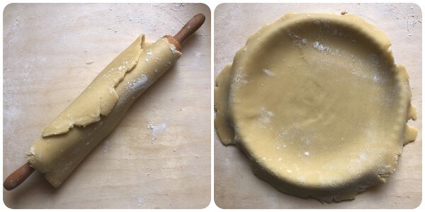 Enquanto a grelha endurece no freezer, amasse os vários recortes com o restante da massa, estenda com o rolo de massa e forre o fundo e as bordas de uma forma para tortas com 24/26 cm de diâmetro.