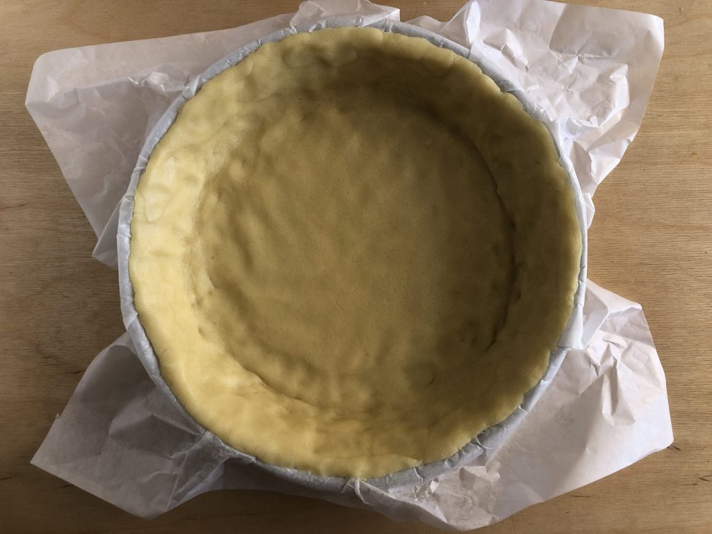 Transfira o disco de massa frola para dentro de uma assadeira com diâmetro de 24/26 cm, mantendo-o apoiado no papel manteiga e revestindo também toda a borda.