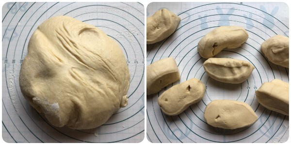 Após a primeira fermentação, transfira a massa para a mesa e divida-a em oito pedaços o mais iguais possível. Recomendo pesar a massa inteira e calcular o peso que cada pedaço deve ter.