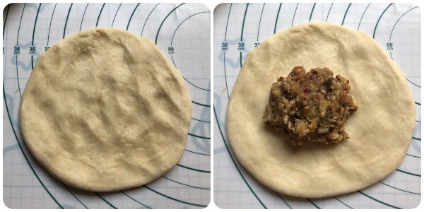 Achate com as mãos cada pedaço, formando um círculo e coloque uma colherada de recheio no centro.