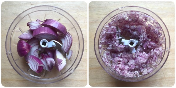 Descasque a cebola (eu usei uma roxa, mas a dourada também serve) e pique-a finamente. Eu usei um picador manual que acho muito prático. Se desejar comprá-lo, você pode encontrá-lo clicando AQUI.