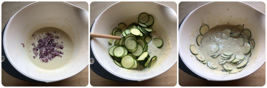 Em seguida, adicione a cebola picada e as abobrinhas e misture delicadamente para que fiquem perfeitamente envoltas pela massa.