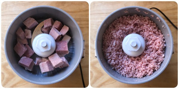 Corte a fatia de presunto cozido em pedaços e pique finamente com um mixer.