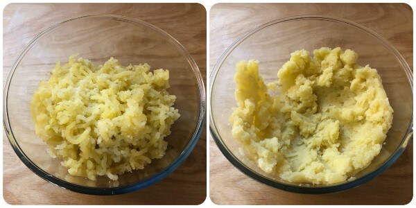 Quando as batatas estiverem cozidas, passe-as no espremedor de batatas, recolhendo o purê em uma tigela grande (não será necessário remover a casca, pois ela ficará no espremedor). Adicione uma generosa pitada de sal e misture.