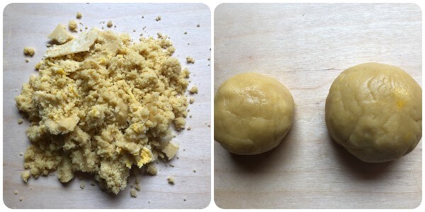 • Transfira a massa obtida para a superfície de trabalho e divida-a em duas partes: uma maior (cerca de 380 g) e outra menor (cerca de 250 g).