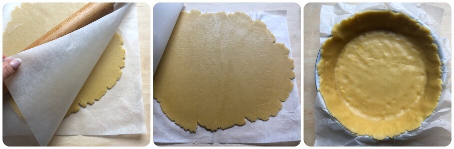 • Neste ponto, coloque a maior parte da massa entre duas folhas de papel manteiga e estenda-a com o rolo em uma folha fina um pouco mais larga que o diâmetro da forma (22/24 cm), pois será necessário cobrir as bordas além do fundo. Depois, coloque-a sobre a forma mantendo-a apoiada na folha de papel manteiga.