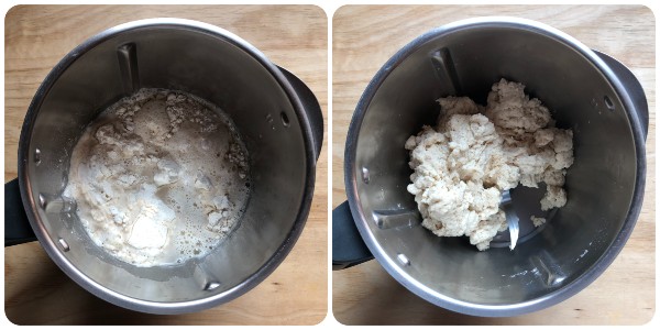 Em uma tigela (ou no copo de um liquidificador) amasse todos os ingredientes até obter uma massa macia e elástica. Eu usei o Bimby por um minuto e meio na velocidade Espiga.