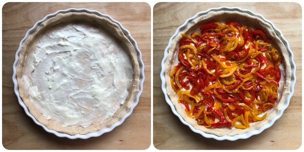 Neste ponto, espalhe a crescenza sobre o fundo, depois distribua sobre ela os pimentões já resfriados.