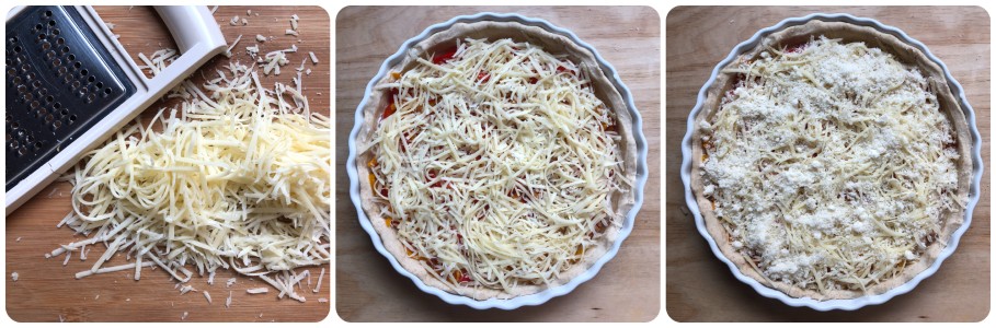 Com um ralador de furos grandes, rale a scamorza em julienne e espalhe-a sobre os pimentões. Depois polvilhe tudo com o queijo ralado.