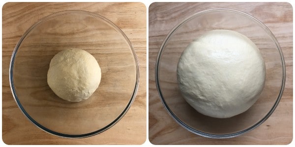 Transfira a mistura para a bancada levemente enfarinhada e trabalhe-a mais um pouco com as mãos. Modele uma bola, coloque-a dentro de uma tigela grande, cubra com filme plástico e deixe crescer em um lugar morno e protegido de correntes de ar até dobrar de volume. O tempo de fermentação depende muito da temperatura do ambiente e pode variar de 3 a 4 horas.