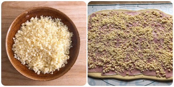 Em seguida, espalhe o queijo fontina previamente triturado em um processador.