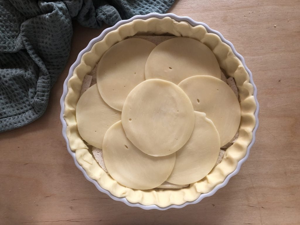 Cubra o pão com as fatias finas de provola. Ela já é vendida fatiada nos supermercados. Transfira a forma para a geladeira enquanto prepara os outros ingredientes.