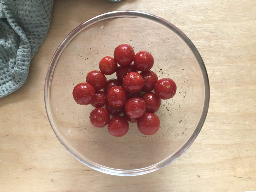 Lave os tomates cereja, seque-os com papel toalha, coloque-os em uma tigela e tempere com azeite, sal e pimenta a gosto.