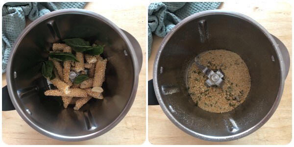 Coloque em um processador de alimentos os grissini com gergelim, um dente de alho descascado e sem o miolo central, algumas folhas de manjericão e triture até obter migalhas grosseiras.