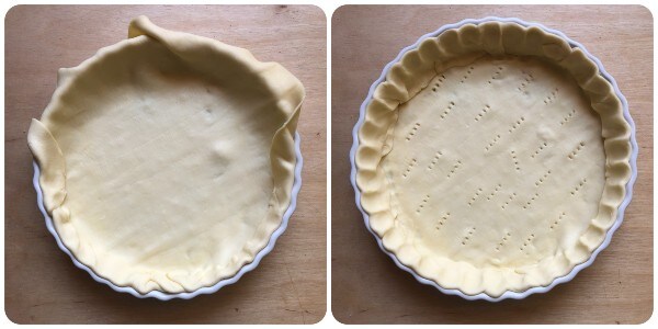 Desenrole o disco de massa folhada e vire-o sobre a forma, ajudando-se com o papel dela. Depois, forre o fundo e as bordas; dobre a massa excedente para dentro e pressione bem nas laterais onduladas da forma com os dedos para que tome a forma das várias ondulações. Por fim, fure o fundo com os dentes de um garfo.
