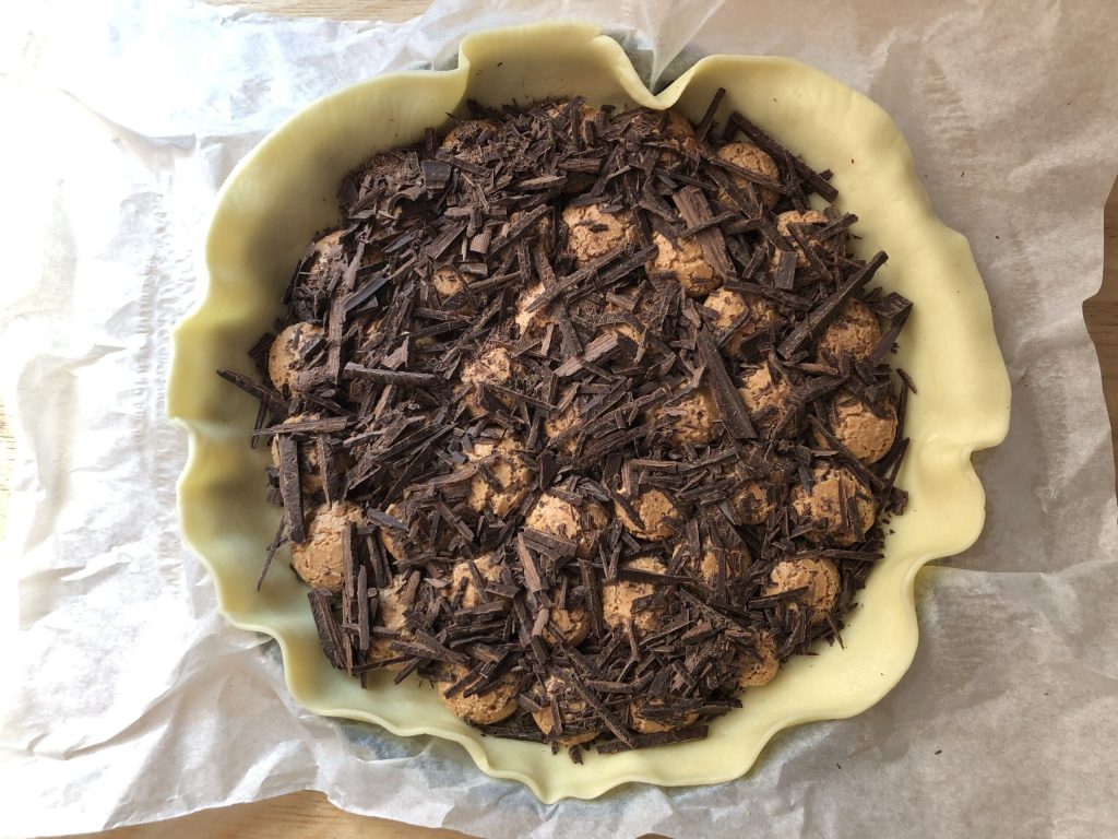 Hoje ofereço a vocês um doce que preparei com a massa folhada pronta e fina. Sim, aquela que se compra em rolos no supermercado. Assim nasceu a minha torta recheada com chocolate e amaretti, perfeita em qualquer momento do dia, desde o café da manhã até o jantar. A cobertura é crocante e o recheio é realmente muito saboroso. Uma torta que se prepara em pouco tempo graças justamente ao uso deste tipo de massa folhada. Obviamente, você pode substituí-la pela massa caseira, mas temo que o resultado não seria o mesmo. E aí? Vai provar?