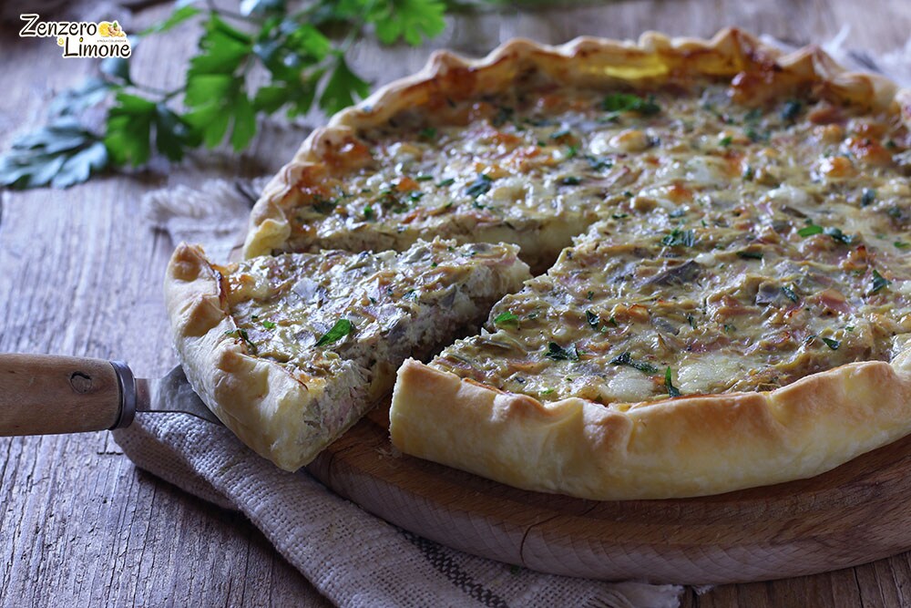 A torta salgada de alcachofra que proponho hoje é um delicioso prato único que inclui entre os ingredientes presunto, provolone, ricota e ovos. É, portanto, bastante rica, muito saborosa e fácil de preparar. É perfeita também servida como entrada. Basta cortá-la em fatias e organizá-las em uma bela tábua. Eu a preparei com massa folhada, mas a brisée também funciona bem. Vamos ver como se faz?