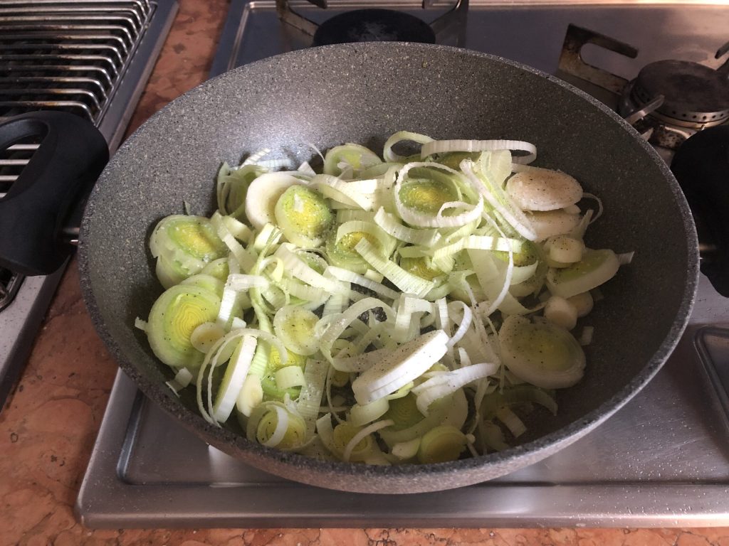 • Em uma panela, aqueça umas duas colheres de azeite e umas duas colheres de água, adicione o alho-poró, sal e pimenta a gosto e deixe murchar por 5 minutos em fogo baixo, mexendo de vez em quando.
