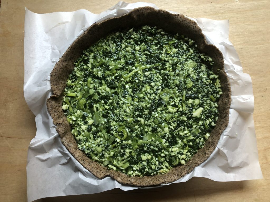 • Neste ponto, despeje dentro da casca de massa o recheio de espinafre e nivele-o com uma espátula.