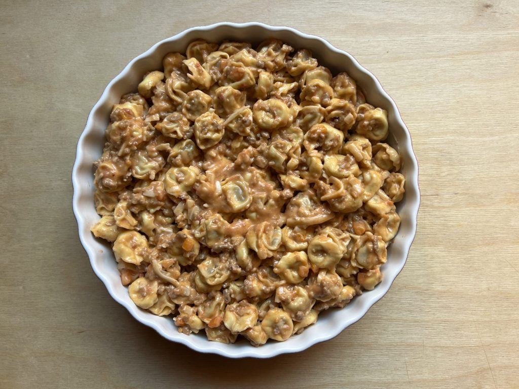 • Adicione também os tortellini e misture-os perfeitamente ao composto até que fiquem totalmente cobertos pelo molho.