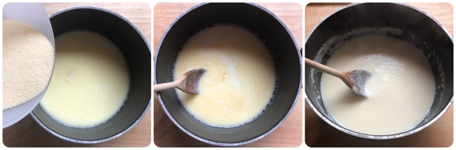 Quando o leite estiver quase fervendo (tenha cuidado para NÃO ferver), adicione a sêmola em chuva, mexendo bem com uma colher de pau para evitar a formação de grumos.