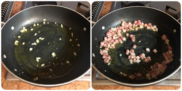 Adicione os cubos de bacon defumado e doure-os por alguns minutos.