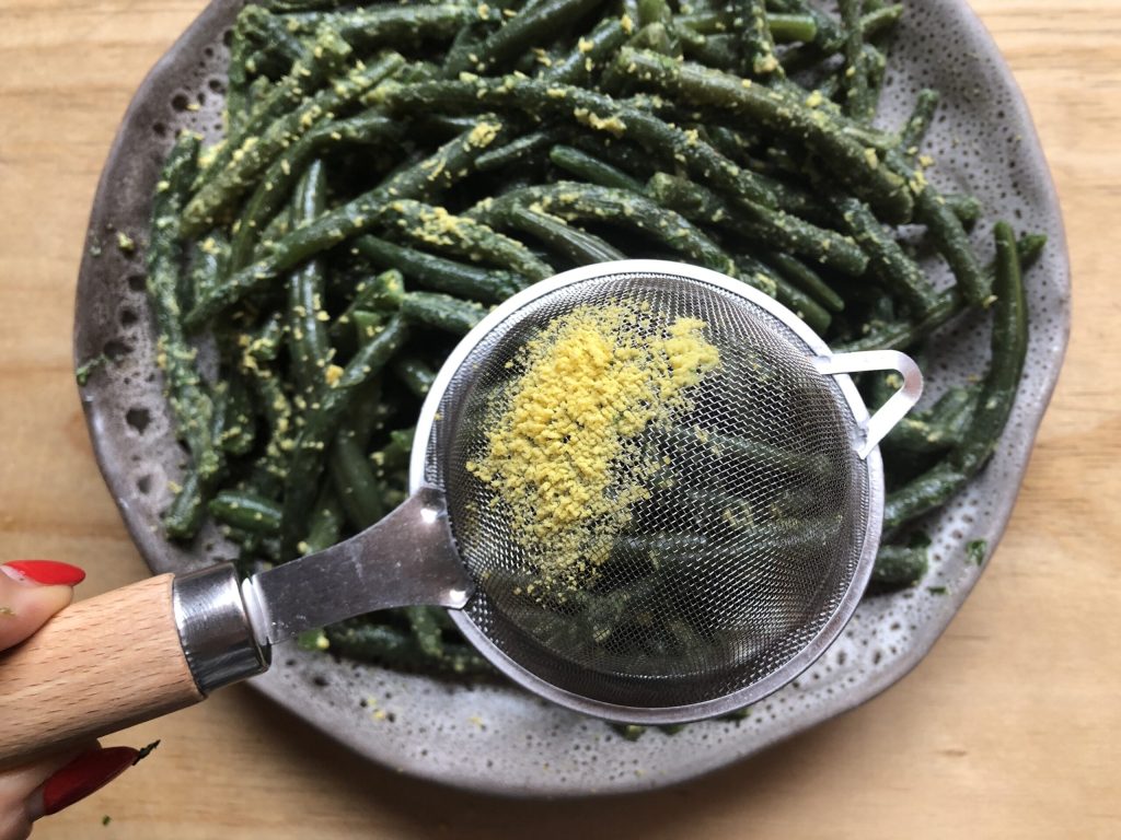 Servir as vagens e polvilhar com a meia gema restante, passando-a por uma peneira para criar o efeito mimosa.