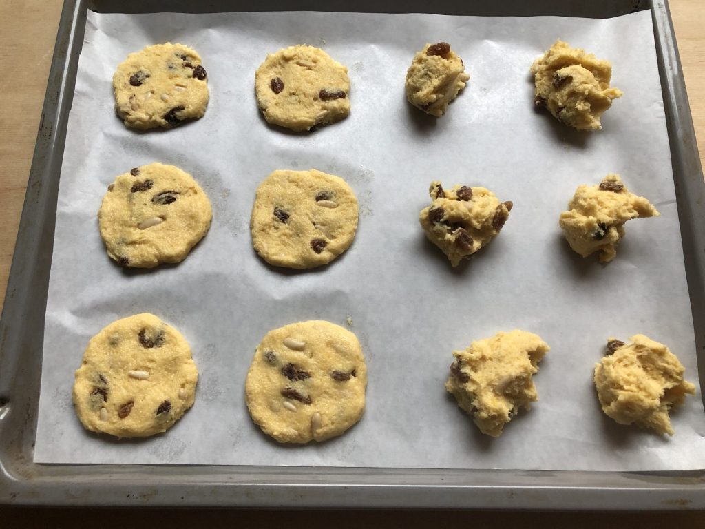 • Achate os montes de massa com os dedos para obter uma forma redonda. Distribua sobre a superfície os pinhões e a uva passa reservados. Adotei esse sistema apenas por uma questão estética: queria que a uva passa e os pinhões fossem visíveis na superfície. Se tudo for misturado, corre-se o risco de que esses ingredientes não apareçam bem, pois ficam totalmente envolvidos pela massa. Alguns biscoitos podem ficar exclusivamente amarelos. E isso eu não queria! Você pode, obviamente, proceder como preferir.