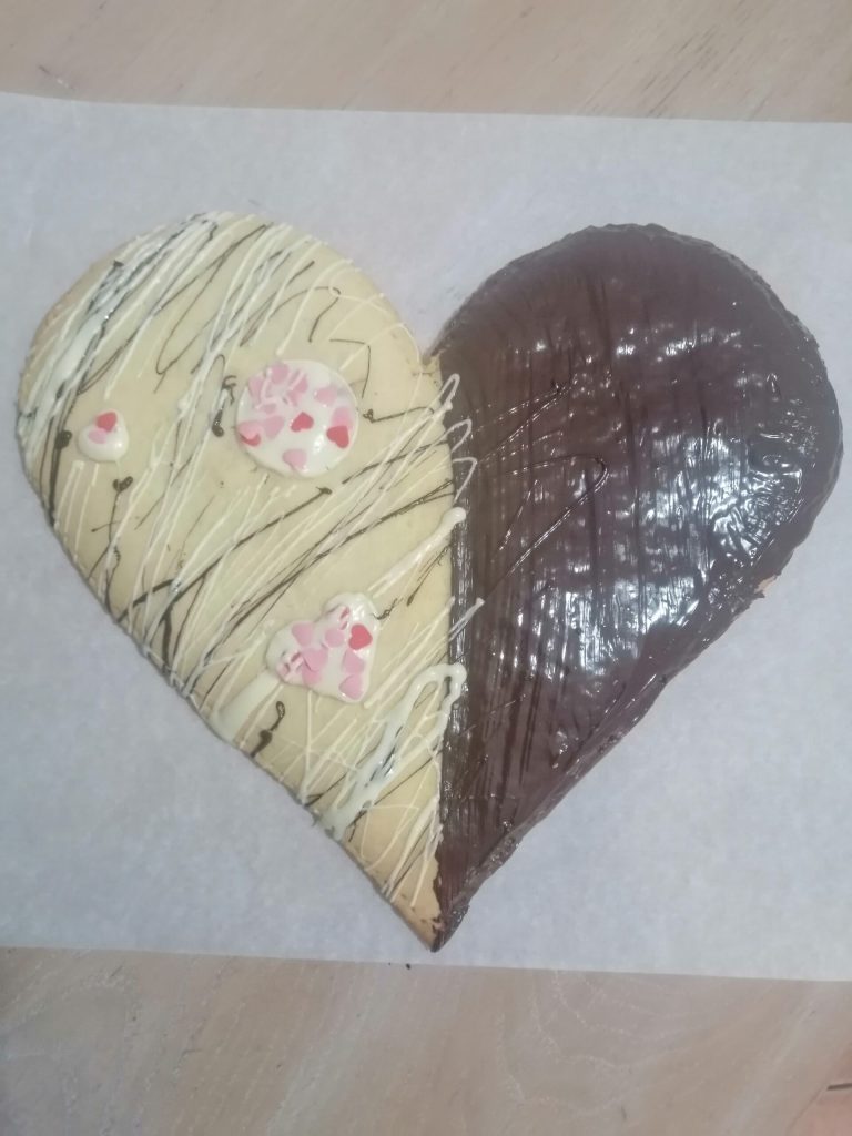 A torta coberta em forma de coração está pronta. Deixe esfriar completamente e depois decore ao seu gosto. Eu decorei metade do coração com chocolate derretido em banho-maria. Derreti o chocolate e depois pincelei com um pincel/espátula/colher. Decorei ao gosto.