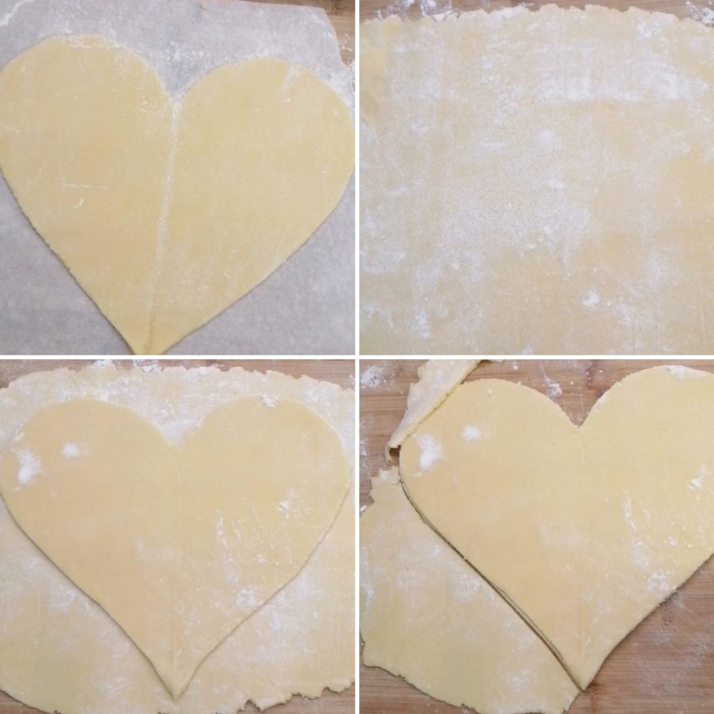 Pegue o bloco de massa e divida-o em duas partes, comece a estender a primeira parte em uma folha de papel manteiga levemente enfarinhada. Se você quiser fazer a forma de coração, enfarinhe levemente a superfície da massa estendida, dobre ao meio e, com uma faca, corte a forma de meio coração, assim você terá um coração regular. Estenda o segundo bloco de massa podre, sobreponha levemente com o primeiro coração, levemente enfarinhado, e corte; este passo ajudará você a ter o mesmo tamanho.