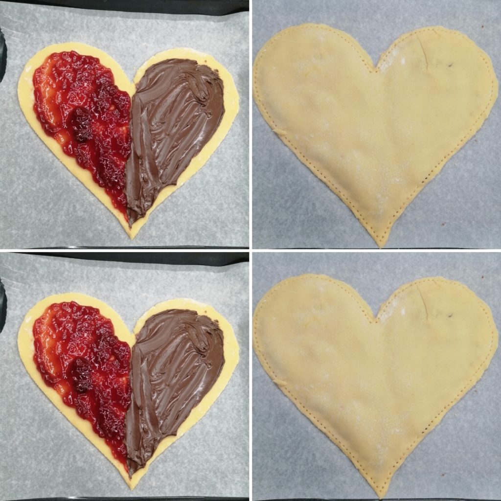 Uma vez que a massa podre em forma de coração esteja pronta, recheie metade da massa com o creme de avelã e a outra metade com a geleia de morango, coloque o outro coração de massa por cima. Selar bem as bordas e levar ao forno a 180° por cerca de 25 minutos.
