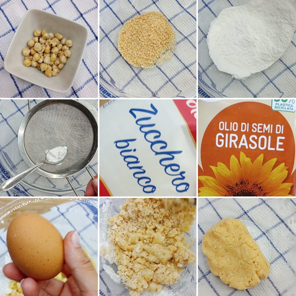 Despeje dentro de uma tigela as avelãs trituradas, a farinha, o fermento, o açúcar, o óleo e por último o ovo. Misture com um garfo e depois com as mãos até formar uma massa.