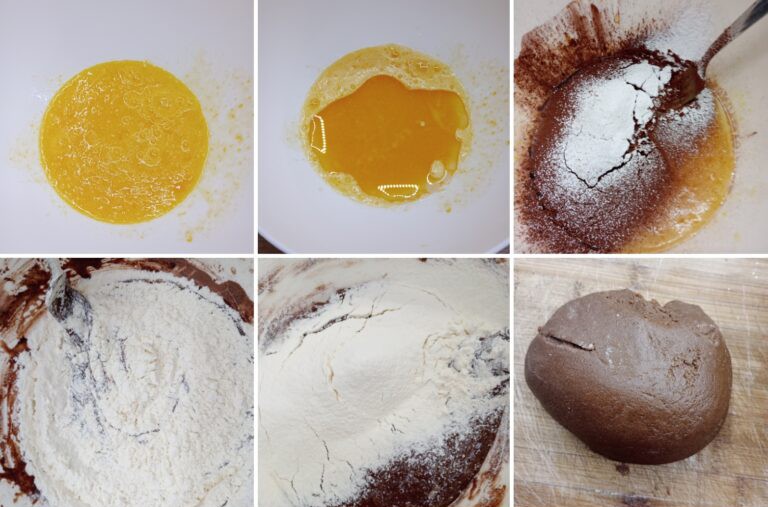 Com um garfo bata os ovos com o açúcar, adicione o óleo e misture. Adicione o cacau e o fermento, comece a adicionar a farinha aos poucos. A massa deve ficar macia, não pegajosa e compacta, se necessário adicione mais farinha.