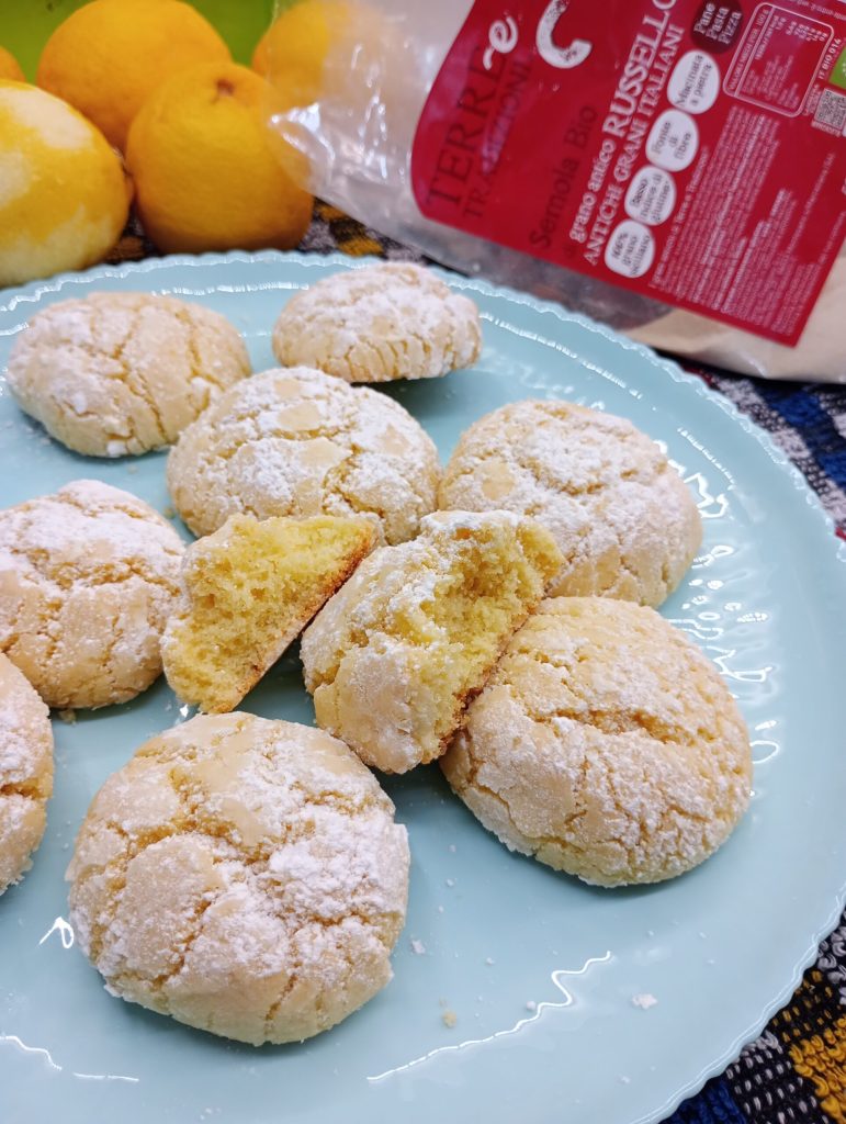 Compartilho com vocês essas pequenas delícias de limão. Nem vou falar do aroma quando os tirei do forno, conquistaram a todos, principalmente meu marido, apesar de ele não gostar muito de farinha de sêmola. Isso mesmo, você entendeu bem, esses docinhos foram feitos com uma farinha de sêmola, ao contrário do meu marido, eu amo muito essa farinha, gosto de usá-la tanto para salgados quanto para doces. Esses biscoitinhos de limão são ideais em qualquer momento do dia, levemente crocantes por fora e macios por dentro.