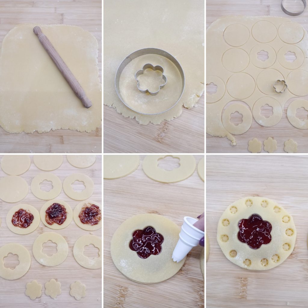 Na metade dos círculos obtenha e espalhe no centro a compota ou o creme de avelã, deixando as bordas livres, coloque por cima o círculo com a decoração central e sele bem as bordas. Decorei as bordas com um bico de confeitar.