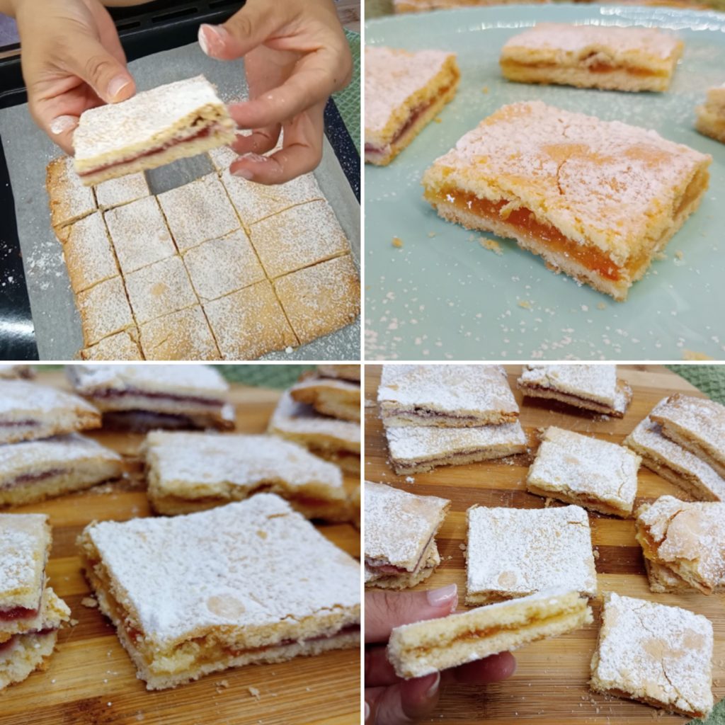 Deixe esfriar completamente, polvilhe com açúcar de confeiteiro se desejar e depois corte quadrados com a ajuda de uma faca.