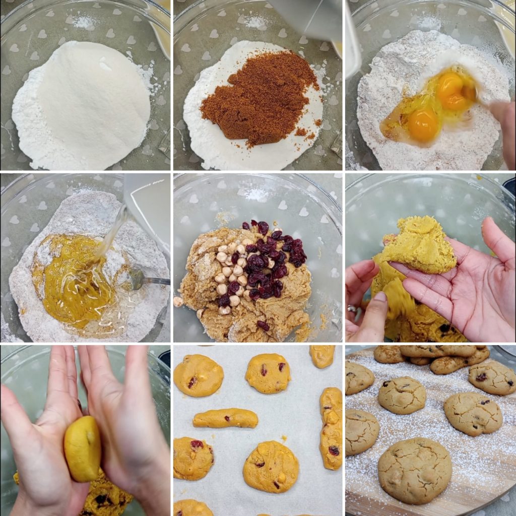 Compartilho a receita desses biscotões deliciosos sem glúten. Eu quis adicionar ao interior da massa as avelãs e cranberries secas, você pode adicionar o que preferir ou mesmo não colocar nada. Eles são macios e saborosos, entre as minhas receitas sem glúten são os biscoitos que mais gosto. Prepará-los é muito rápido e o resultado é realmente surpreendente. Venha comigo que já vamos começar a bagunçar na cozinha.