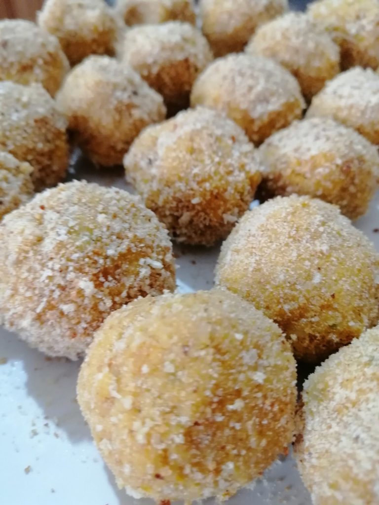 • Neste ponto, forme os bolinhos e passe-os na farinha de rosca. Para o cozimento, você tem duas opções: