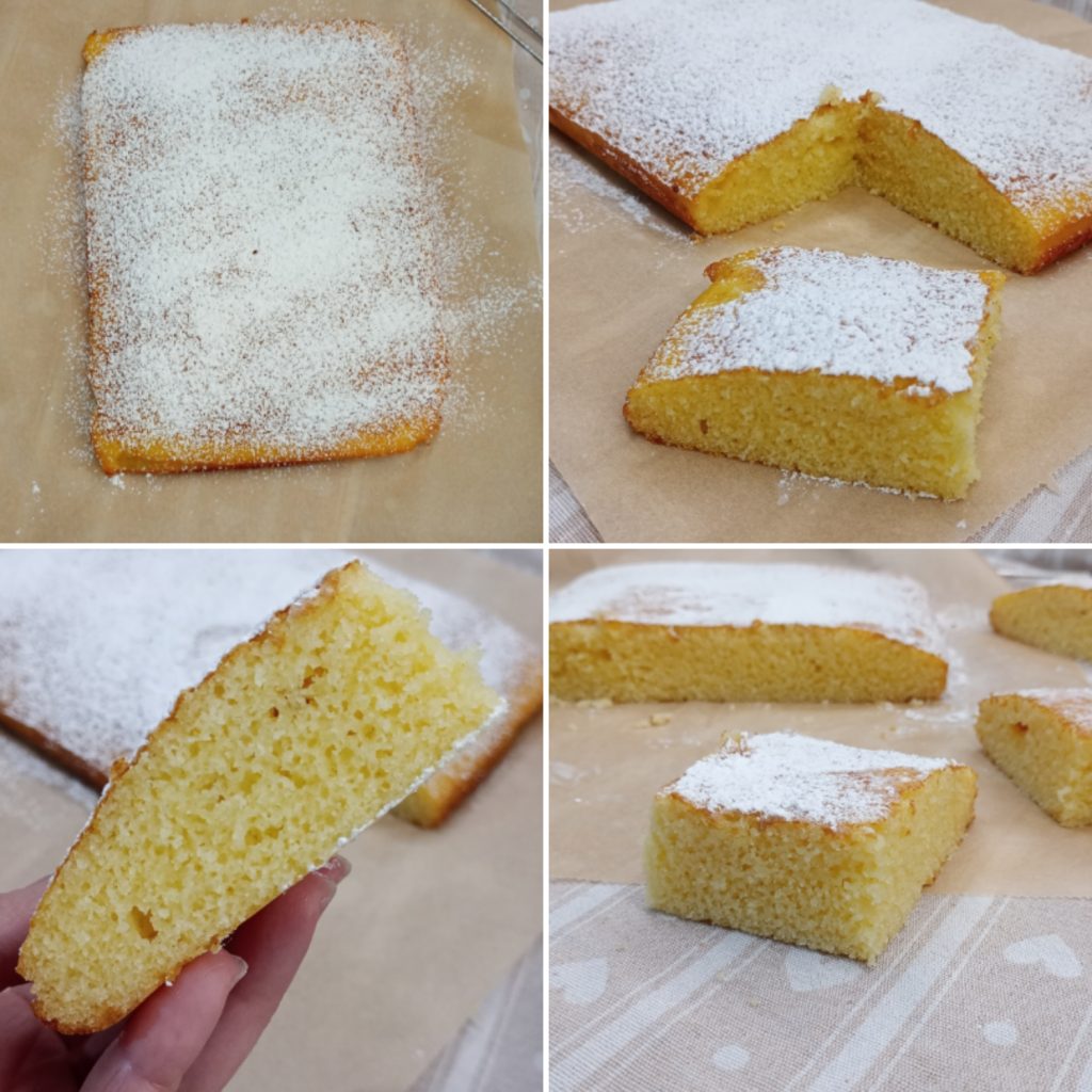 Unte e enfarinhe (ou forre com papel manteiga) uma forma retangular de 30×20 ou uma forma redonda de 22-24 cm e despeje a massa, nivelando bem.Asse em forno estático pré-aquecido a 180°C por cerca de 25 minutos se usar a forma retangular, se usar uma forma redonda pode ser necessário prolongar o tempo de cozimento. Em qualquer caso, sempre faça o teste do palito antes de retirar do forno: se sair seco, o bolo está pronto.